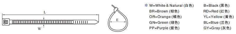 | 编 号 Item NO. | L(长) | W(宽) (mm) | 最大捆扎范围 Max.Bundle Dia. E (mm) | 拉 力 Min.loop Tensile Strength | ||